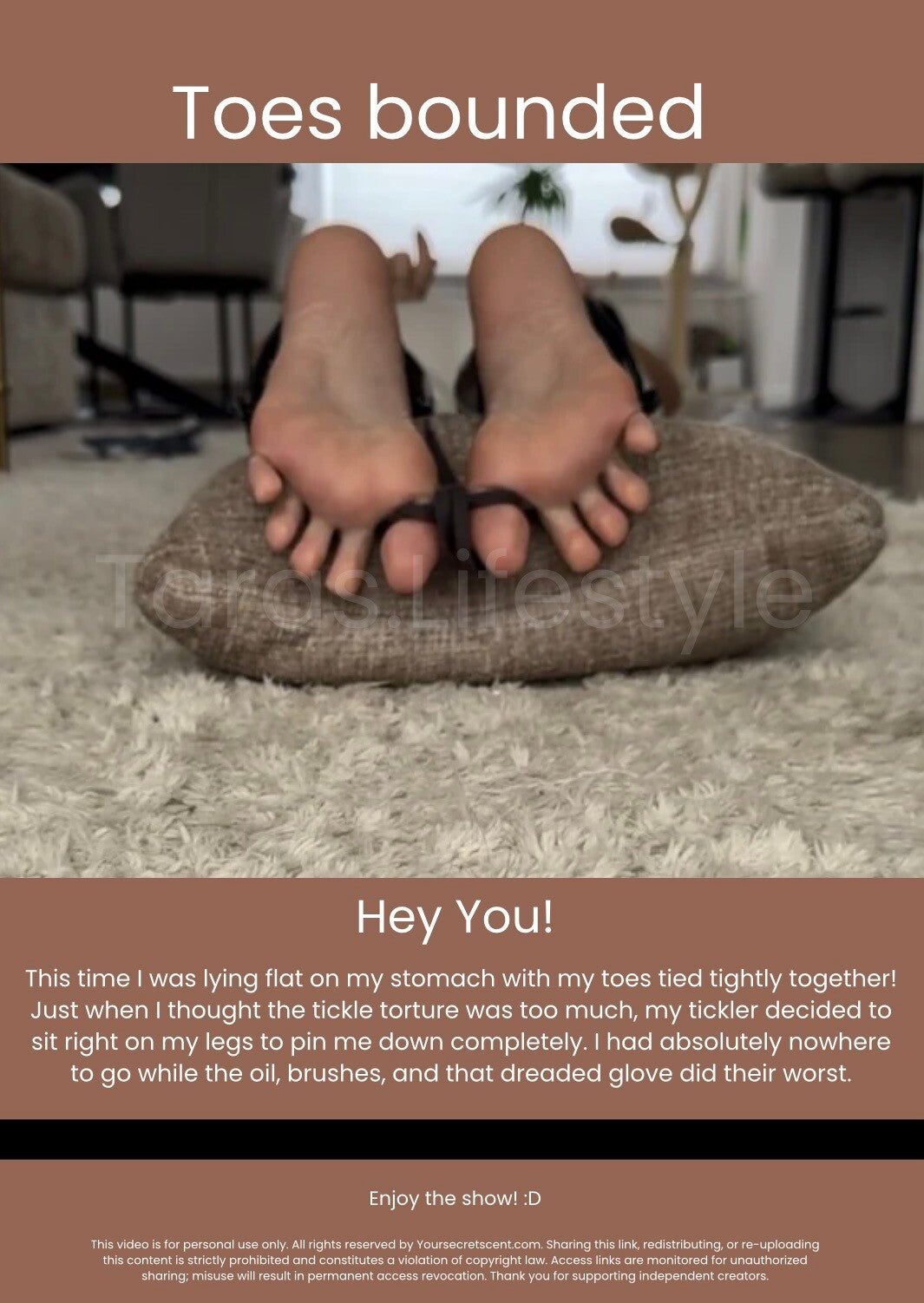 Lying on my stomach is already a vulnerable position, but it gets worse... my toes are tied together and my tickler is sitting right on my legs! I am completely pinned to the floor, unable to kick or escape. Watch me struggle for air while my soles get the most intense treatment yet.
